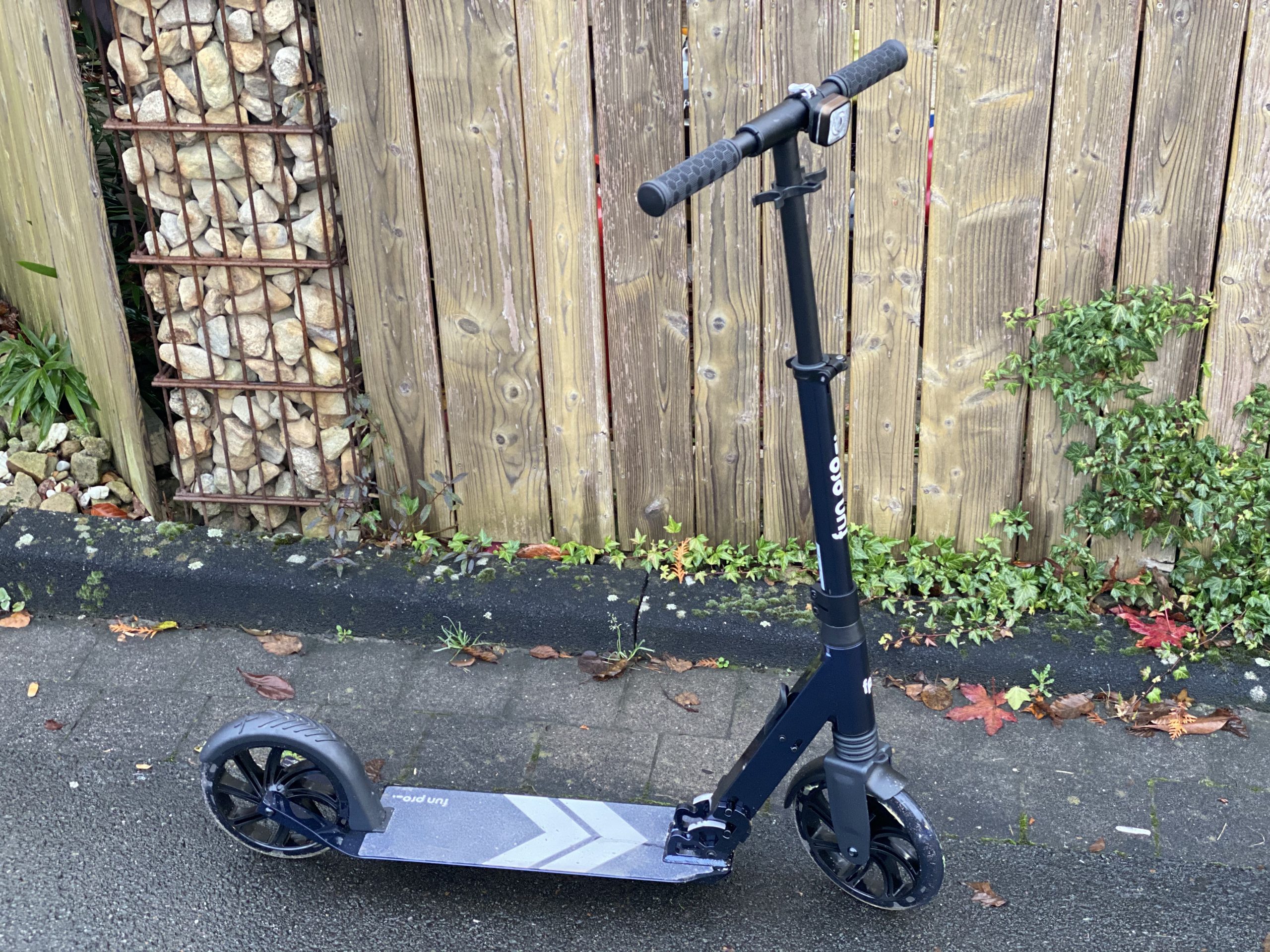 Bei der Suche meines Rollers hatte ich wenig Vorgaben. Er sollte mit Licht in den Rädern ausgestattet sein, stabil sein und auch von uns Erwachsenen genutzt werden können. Es sollte ein 2-Rad-Roller sein und das bei uns im Haushalt existierende 3-Rad-Modell ablösen. Das Modell „fun pro FIVE“ erfüllt all diese Eigenschaften. Der Roller ist für große Kinder ab 10 Jahren geeignet und auch für Erwachsene. Da er bis 100Kg Gewicht tragen kann, dürften die meisten Erwachsenen damit zurecht kommen. Darüber hinaus lässt sich die Lenkerstange mit einem Schnellspanner zwischen 88 und 106cm einstellen. Das ist für Körpergrößen von 120cm bis 190cm ausreichend. Tipp: Kleinere Kinder können auch nicht wirklich gut mit dem Roller umgehen. Macht nicht den Fehler und kauft einen zu großen Roller für euer Kind. Wer hier der Meinung ist Geld zu sparen, wird dem Kind eher den Spaß am Roller verderben. Aufgrund der Größe und des Gewichts ist das Handling für kleine Kinder einfach zu schwer. Die Fahrt wird wackelig und das Kind unsicher. Schaut daher wirklich genau hin und kauft ein Modell, das zur Größe eures Kinds passt.