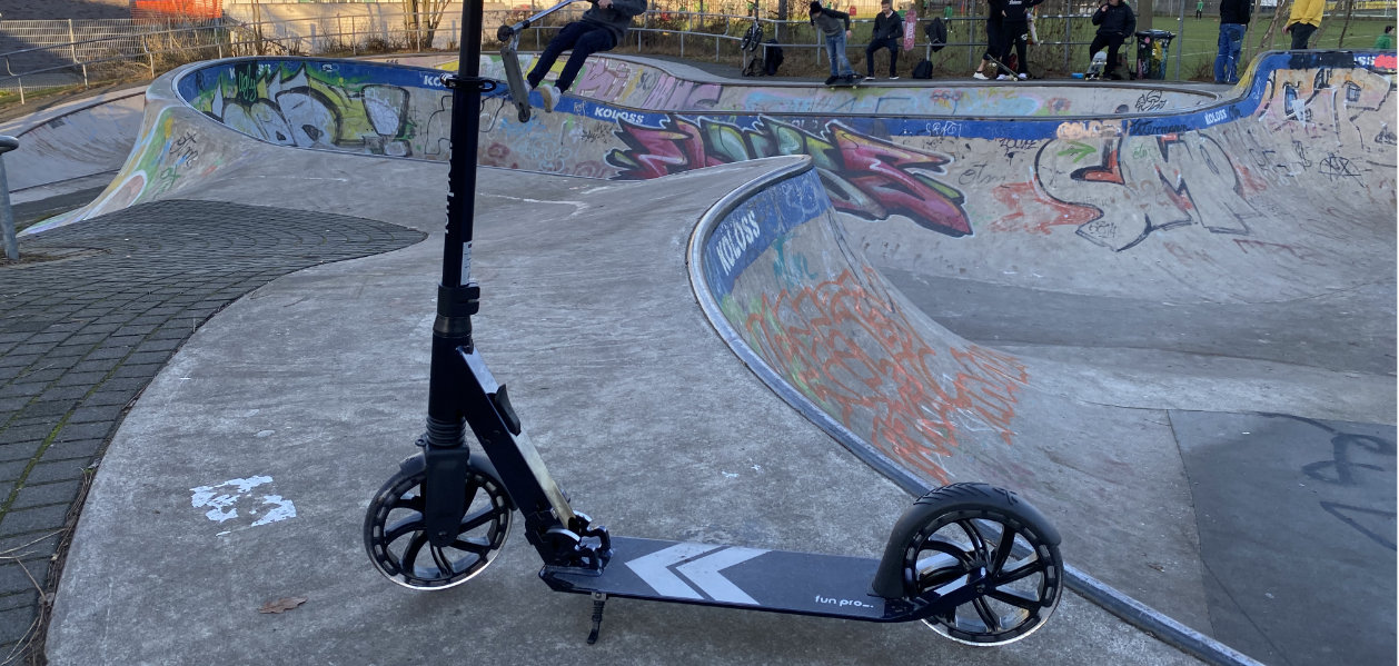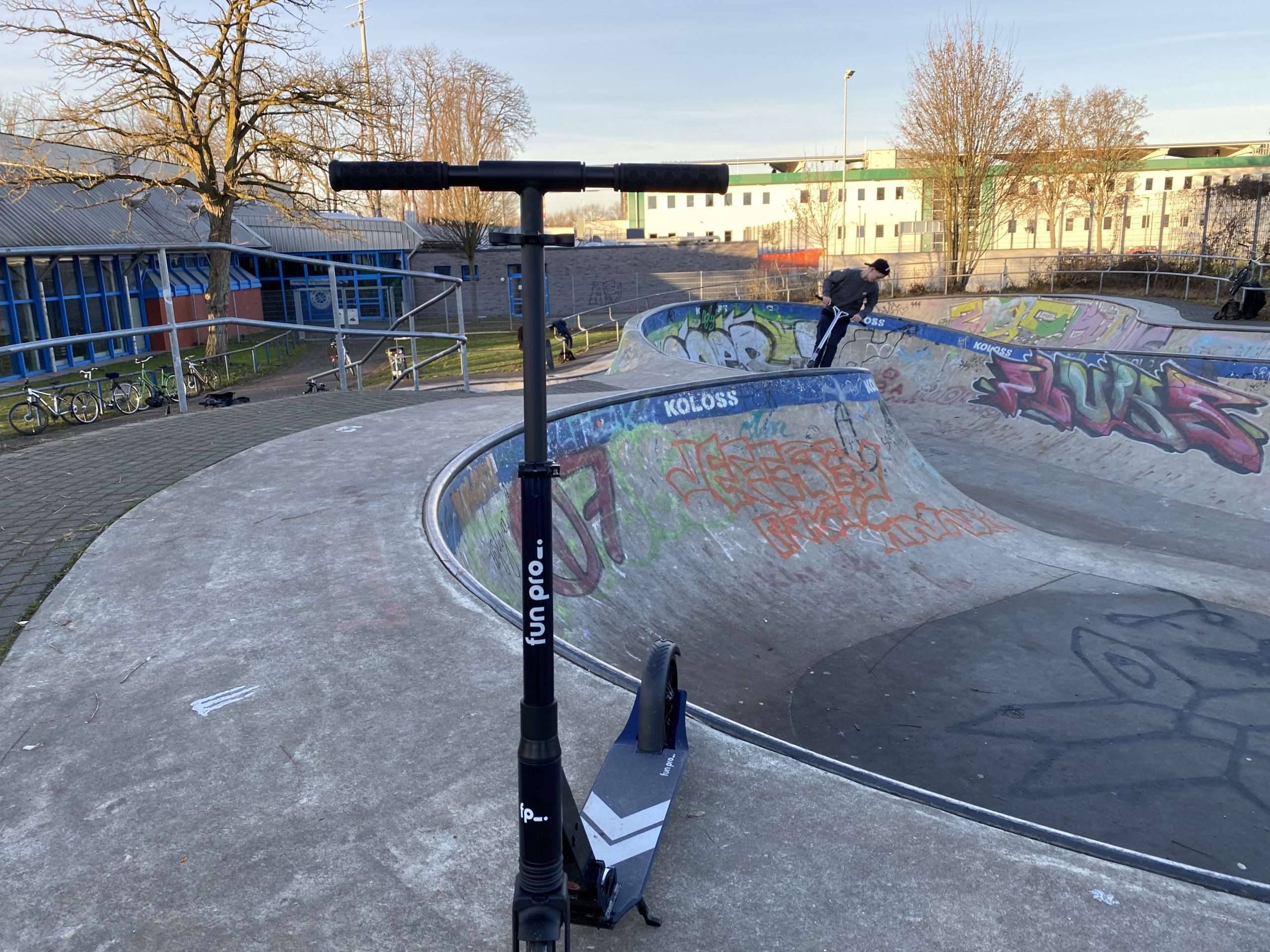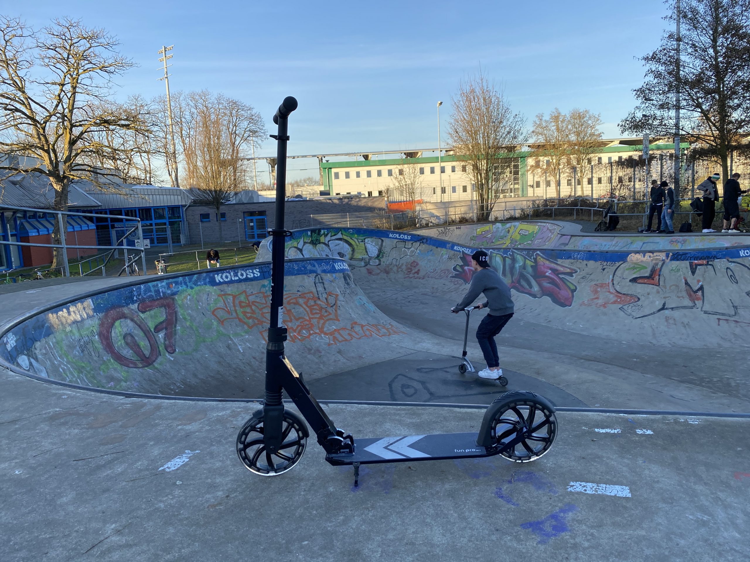 Da auch ich auf der Suche nach einem Roller bin, habe ich mir die Produkte näher angeschaut. Das Unternehmen bietet mit dem Modell „fun pro ONE“ einen Roller für Einsteiger bis 6 Jahren. Das Modell verfügt über zwei Rollen an der Vorderseite. Ebenso der „fun pro TWO“, der sich an Kinder bis 10 Jahren richtet. Das Modell „fun pro THREE“ ist ein 2-Rad-Roller für Kinder ab 6 Jahren. Dann gibt es noch einen Stuntscooter und das Modell „fun pro FIVE“ für Kinder ab 10 Jahren. Letzteres Modell hat mir das Unternehmen für einen Test zugesandt.