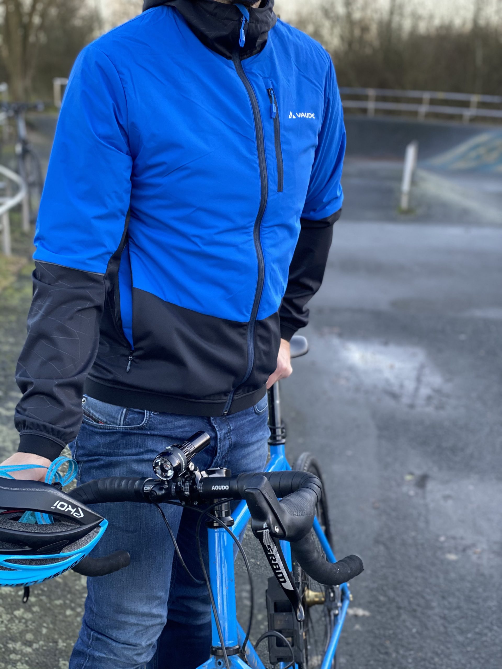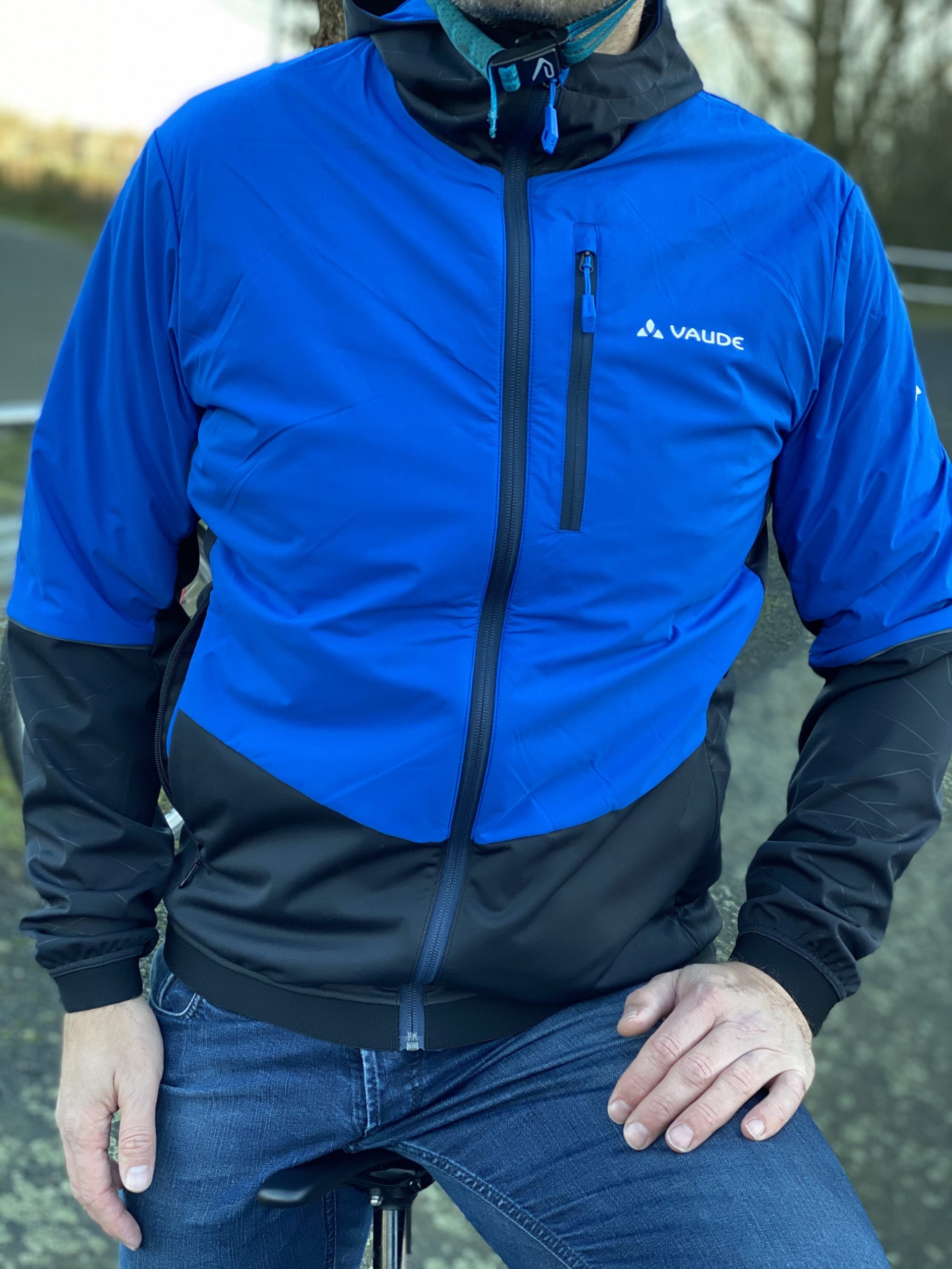 Die Jacke hat vorgeformte Ärmel und ist sehr sportlich geschnitten. Sie besteht aus einem Stretch-Material. Die Elastizität wird durch einen hohen Elastananteil erreicht. Dadurch erhält man eine hohe Bewegungsfreiheit beim Sport. Am den Ärmeln und am Saum sind elastische Bündchen angebracht. Mir ist aufgefallen, das bei einigen Hosen, insbesondere bei Jeans, der Saum hochrutscht. Das ist nicht ganz so glücklich, da bei den kalten Temperaturen der Rücken schnell frei liegen kann. Vielleicht sollte man in dem Zusammenhang dann doch eine Nummer größer wählen. Die Jacke verfügt über eine verdeckte Brusttasche mit einem wasserabweisenden Reißverschluss. An der Front sind zwei weitere Taschen abgebracht, die für Ventilation sorgen. Zusätzlich können Reißverschlüsse an den Armen geöffnet werden. Hier wird für maximale Abfuhr von Feuchtigkeit gesorgt. Die Kapuze ist etwas angeschnitten und passt auch über den Helm. Für die Sicherheit im Dunkeln sorgen reflektierende Elemente. Die Color Block Optik sieht dazu stimmig aus.